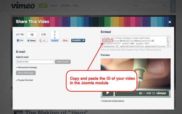 - Go to the Vimeo page (or Youtube) of your video and click on the button "share"